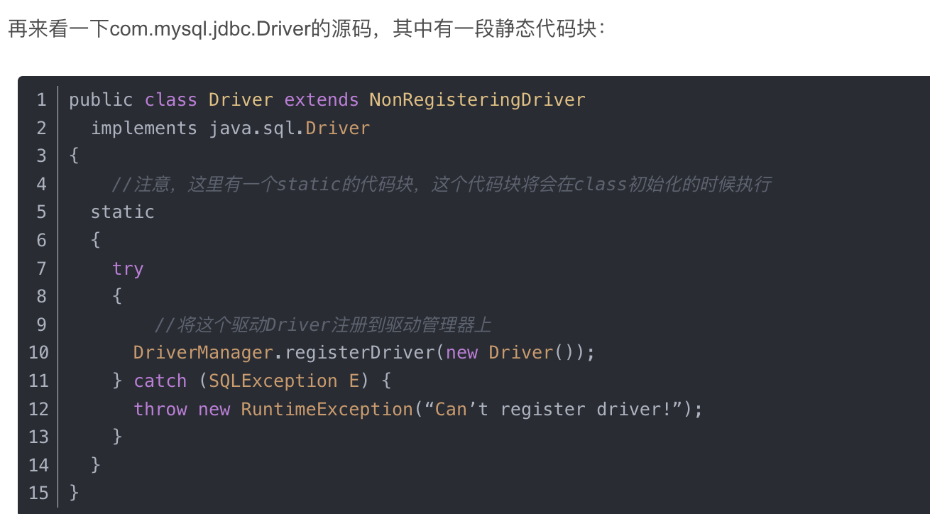 JDBC Driver源码如下,因此使用Class.forName(classname)才能在反射回去类的时候执行static块。