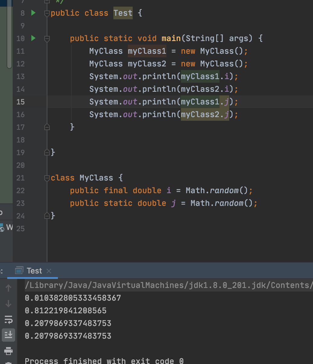 public class Test {public static void main(String[] args) {MyClass myClass1 = new MyClass();MyClass myClass2 = new MyClass();System.out.println(myClass1.i);System.out.println(myClass2.i);System.out.println(myClass1.j);System.out.println(myClass2.j);}}class MyClass {public final double i = Math.random();public static double j = Math.random();