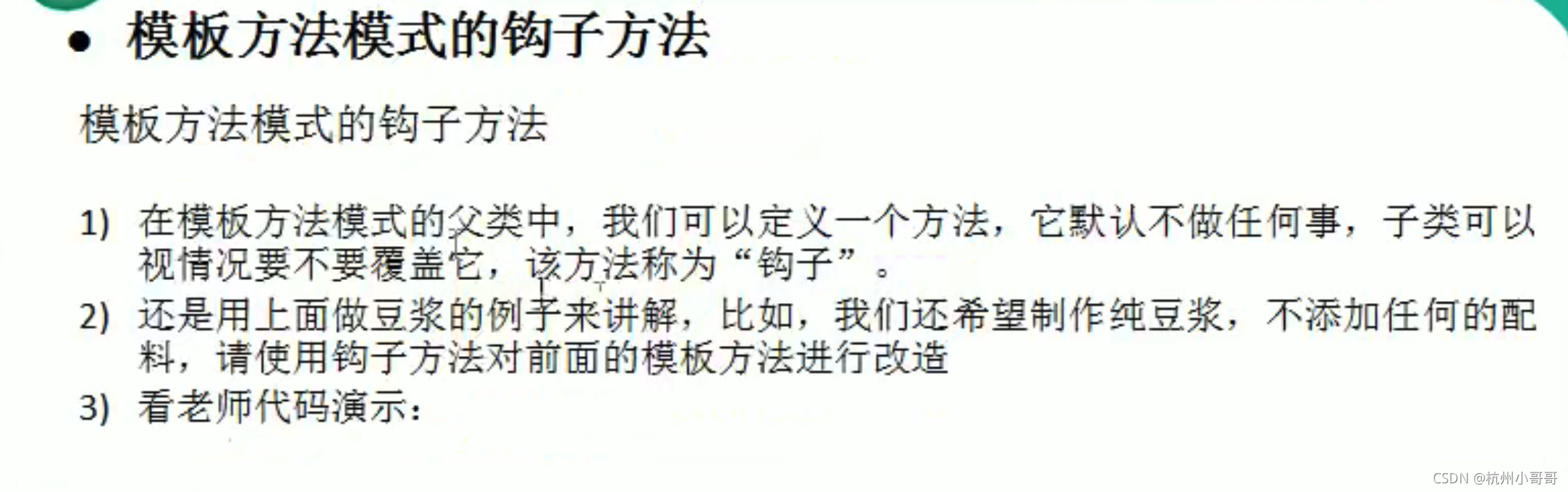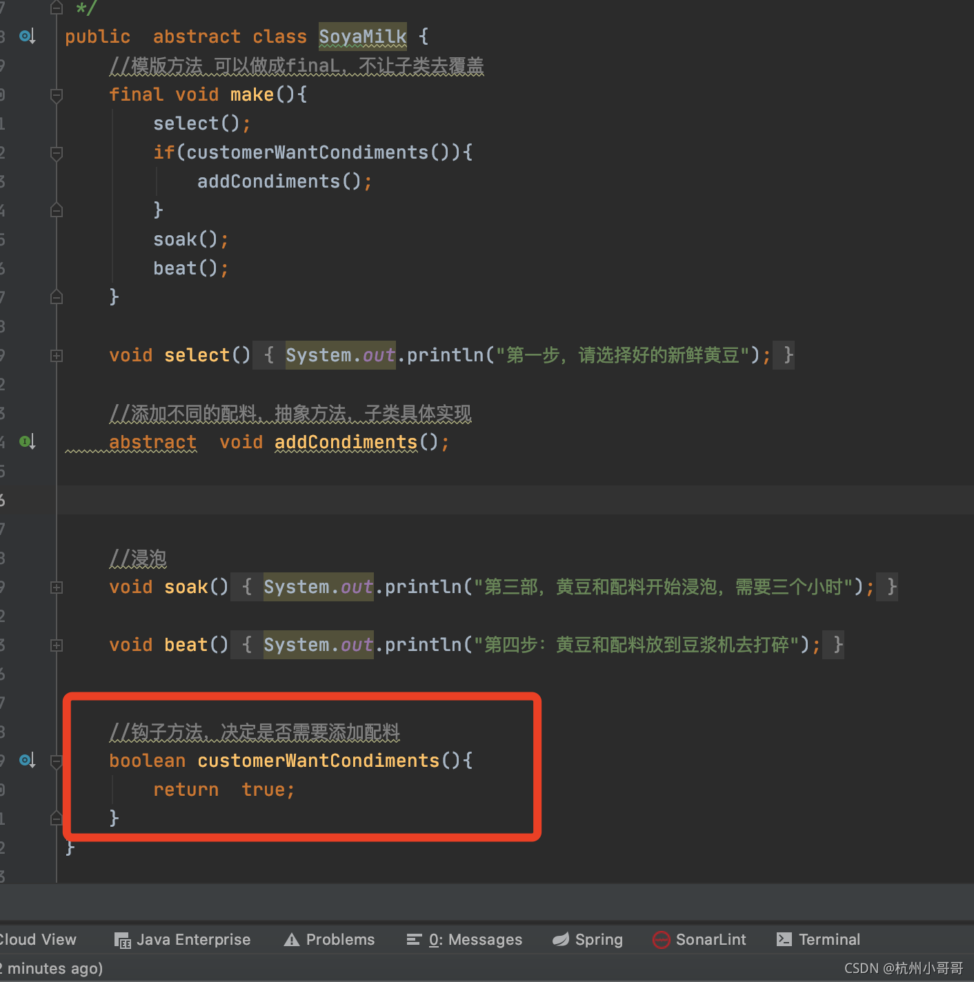 public abstract class SoyaMilk {//模版方法 可以做成finaL,不让子类去覆盖final void make(){select();if(customerWantCondiments()){addCondiments();}soak();beat();}void select(){System.out.println("第一步,请选择好的新鲜黄豆");}//添加不同的配料,抽象方法,子类具体实现abstract void addCondiments();//浸泡void soak(){System.out.println("第三部,黄豆和配料开始浸泡,需要三个小时");}void beat(){System.out.println("第四步:黄豆和配料放到豆浆机去打碎");}//钩子方法,决定是否需要添加配料boolean customerWantCondiments(){return true;}