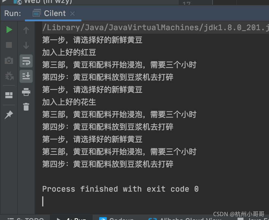 public class Cilent {public static void main(String[] args) {//制作红豆豆浆SoyaMilk readBeanSoyaMilk = new ReadBeanSoyaMilk();readBeanSoyaMilk.make();//制作花生豆浆SoyaMilk soyaMilk = new PeanutSoyaMilk();soyaMilk.make();//制作纯豆浆SoyaMilk ps = new PureSoyaMilk();ps.make();}