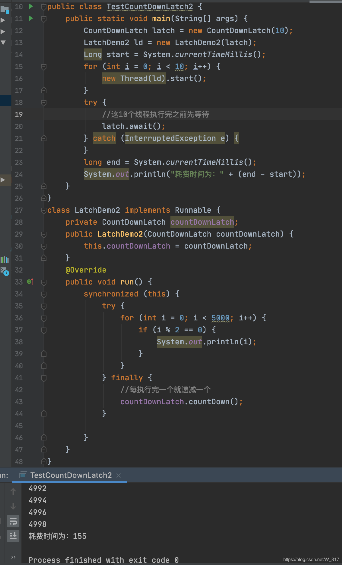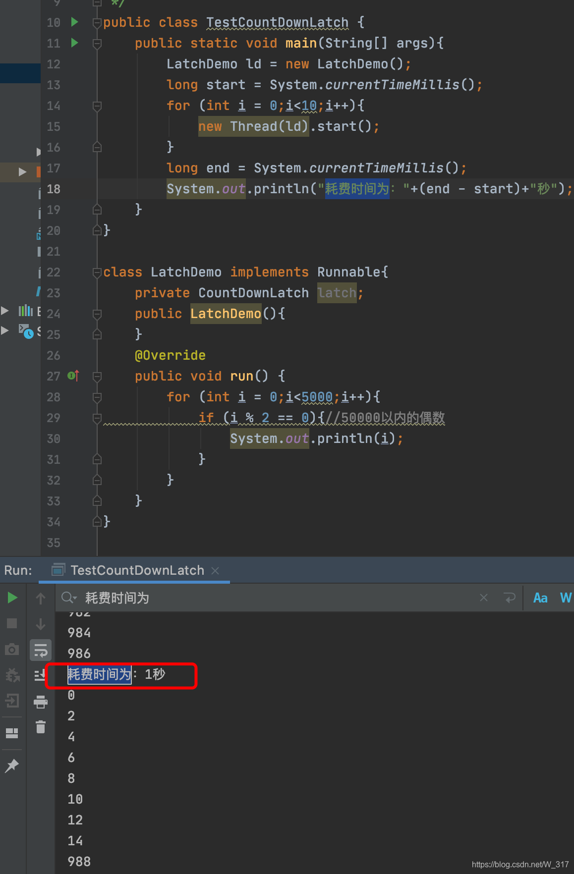 这段代码就是10个线程同时去输出5000以内的偶数,然后在主线程那里计算执行时间。其实这是计算不了那10个线程的执行时间的,因为主线程与这10个线程也是同时执行的,可能那10个线程才执行到一半,主线程就已经输出“耗费时间为x秒”这句话了。所有要想计算这10个线程执行的时间,就得让主线程先等待,等10个分线程都执行完了才能执行主线程。这就要用到闭锁。看如何使用: