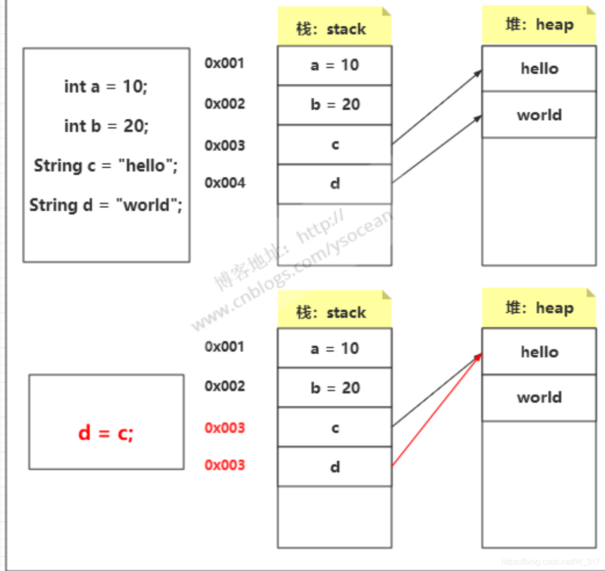 上图定义的 a 和 b 都是基本类型,其值是直接存放在栈中的;而 c 和 d 是 String 声明的,这是一个引用类型,引用地址是存放在 栈中,然后指向堆的内存空间。