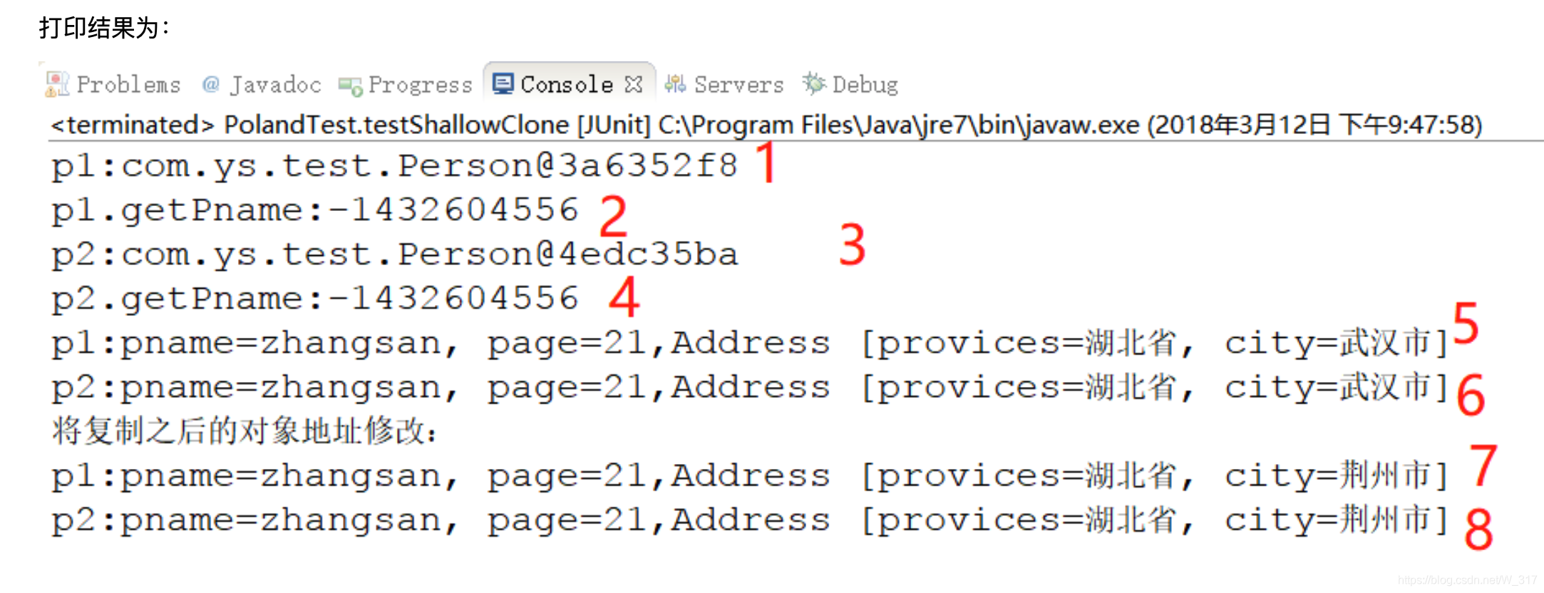 接着看测试内容,首先我们创建一个Person 类的对象 p1,其pname 为zhangsan,page为21,地址类 Address 两个属性为 湖北省和武汉市。接着我们调用 clone() 方法复制另一个对象 p2,接着打印这两个对象的内容。