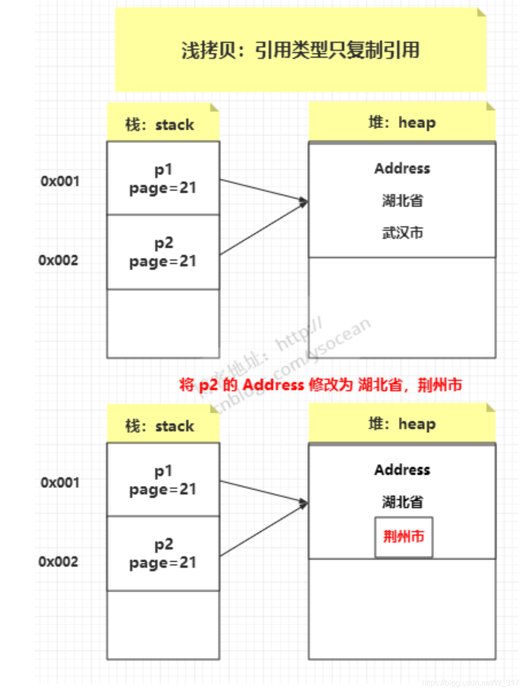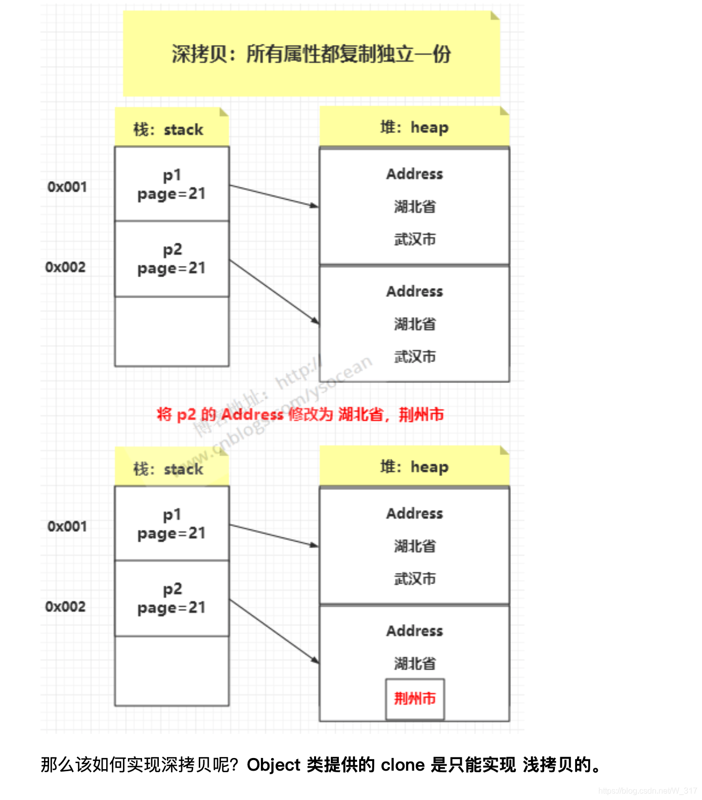 也就是说对象 Person 的属性 Address,经过 clone 之后,其实只是复制了其引用,他们指向的还是同一块堆内存空间,当修改其中一个对象的属性 Address,另一个也会跟着变化。