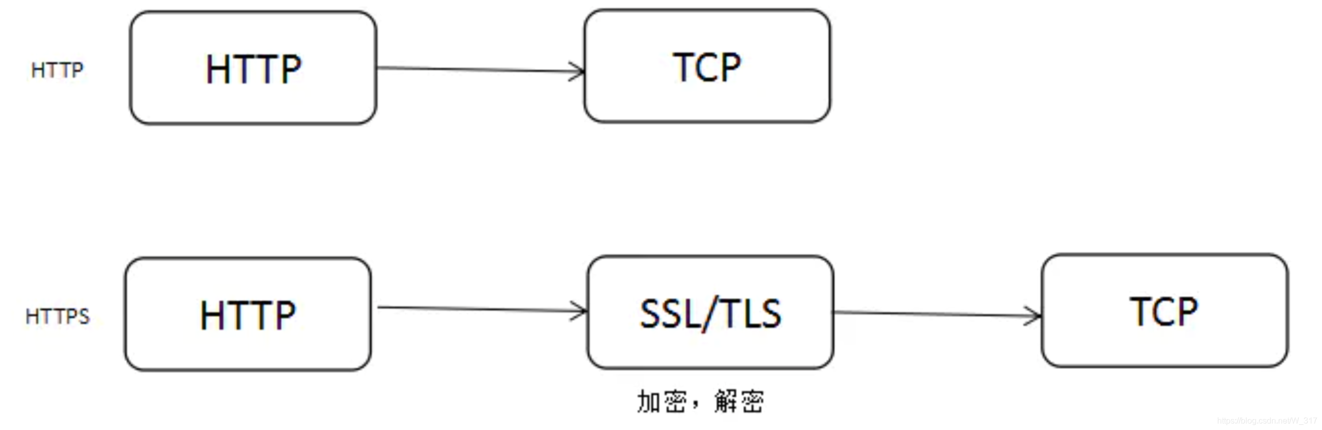 - HTTP协议运行在TCP之上,所有传输的内容都是明文,HTTPS运行在SSL/TLS之上,SSL/TLS运行在TCP之上,所有传输的内容都经过加密的。