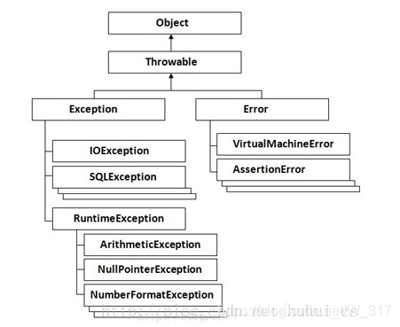 Java把异常当做对象来处理,并定义一个基类java.lang.Throwable作为所有异常的超类。Java中的异常分为两大类:错误Error和异常Exception,Java异常体系结构如下图所示
