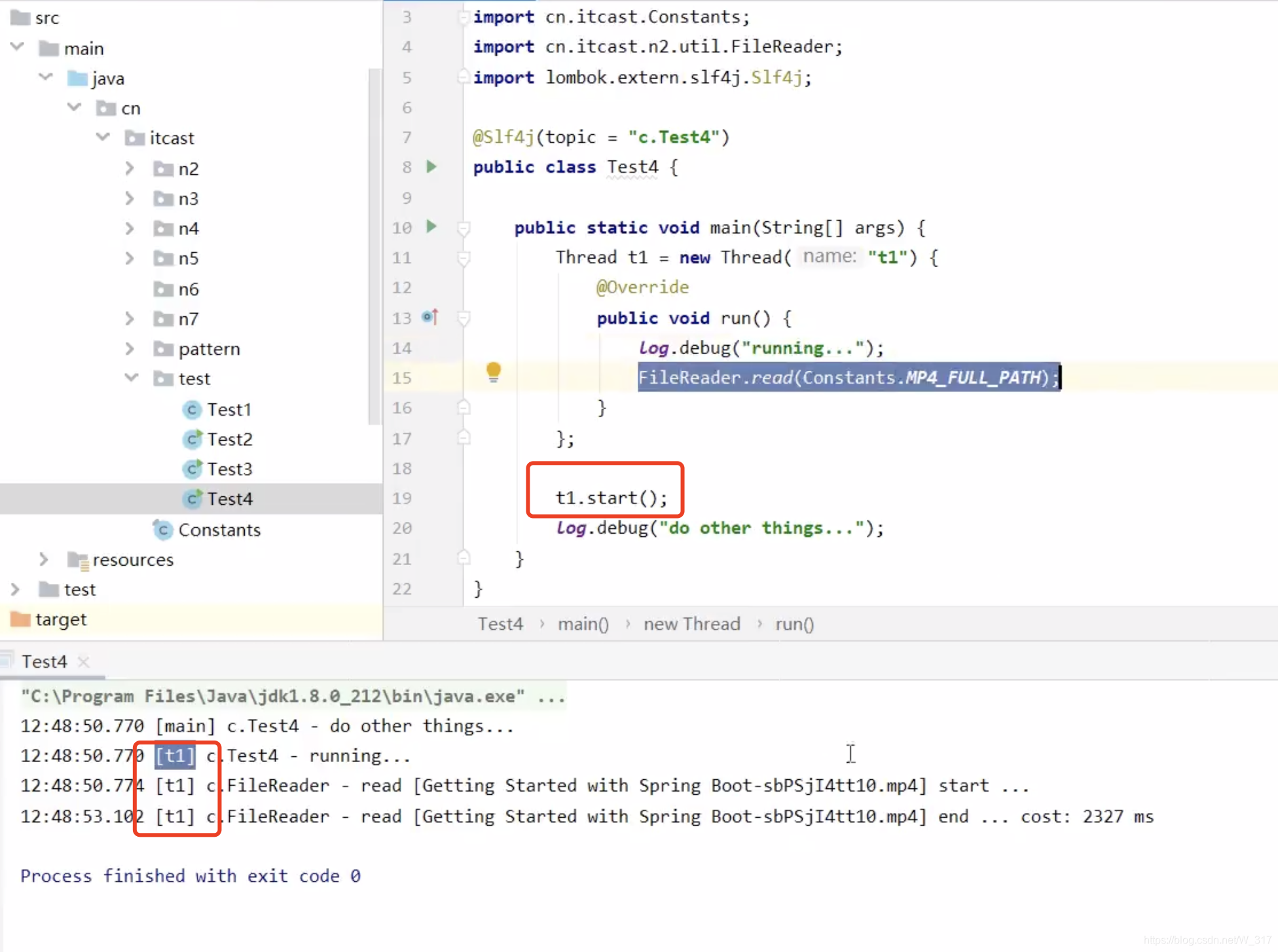 start()方法启动了一个新线程,启动了线程,从如下代码看出t1线程执行了代码