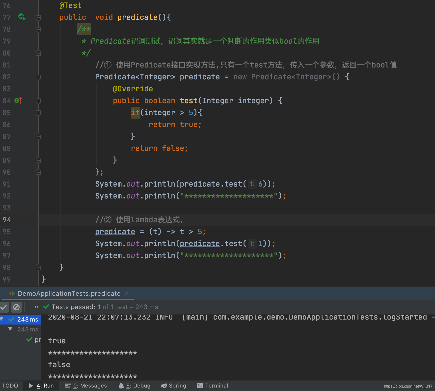 @Testpublic void predicate(){/*** Predicate谓词测试,谓词其实就是一个判断的作用类似bool的作用*///① 使用Predicate接口实现方法,只有一个test方法,传入一个参数,返回一个bool值Predicate<Integer> predicate = new Predicate<Integer>() {@Overridepublic boolean test(Integer integer) {if(integer > 5){return true;}return false;}};System.out.println(predicate.test(6));System.out.println("********************");//② 使用lambda表达式,predicate = (t) -> t > 5;System.out.println(predicate.test(1));System.out.println("********************");}