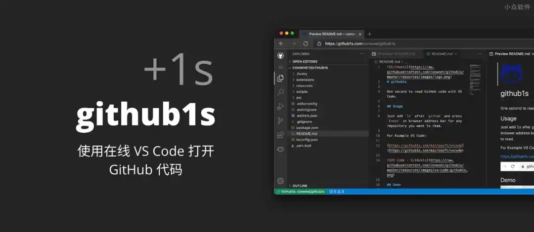 这是一个很有创意、很赞的项目,只需要在对应的 GitHub 项目 URL 后面加上 1s,就能用在线版 VS Code 打开 GitHub 上的代码。