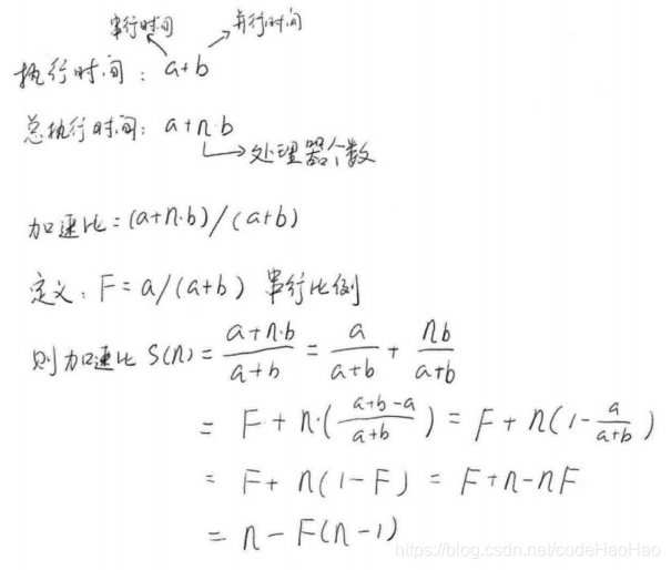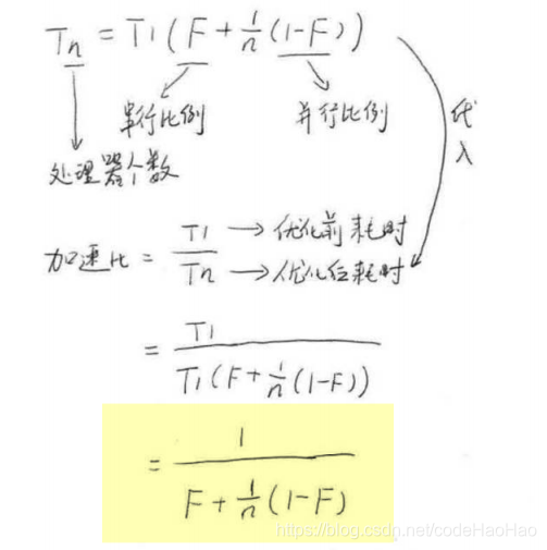 所谓加速比就是优化前的耗时与优化后耗时的比值。加速比越高,表明优化效果越明显。图1-1 为Amdahl公式推导过程,其中 n 表示处理器个数,T 表示时间,T1 表示优化前耗时(也就是只有 1 个处理器时的耗时),Tn 表示使用 n 个处理器优化后的耗时。F 是程序中只能串行执行的比例。