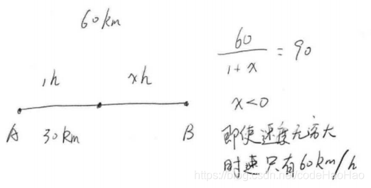 求解图3-1的方程,你会发现如果想要达到90km/h的时速,那么你从AB中点到达B点的时间会是一个负数,这显然不是一个合理的结论。实际上,如果前半程 30km你使用了一小时,那么即使你从中点到B点使用光速,也 只能把整体的平均时速维持在 60km/h。