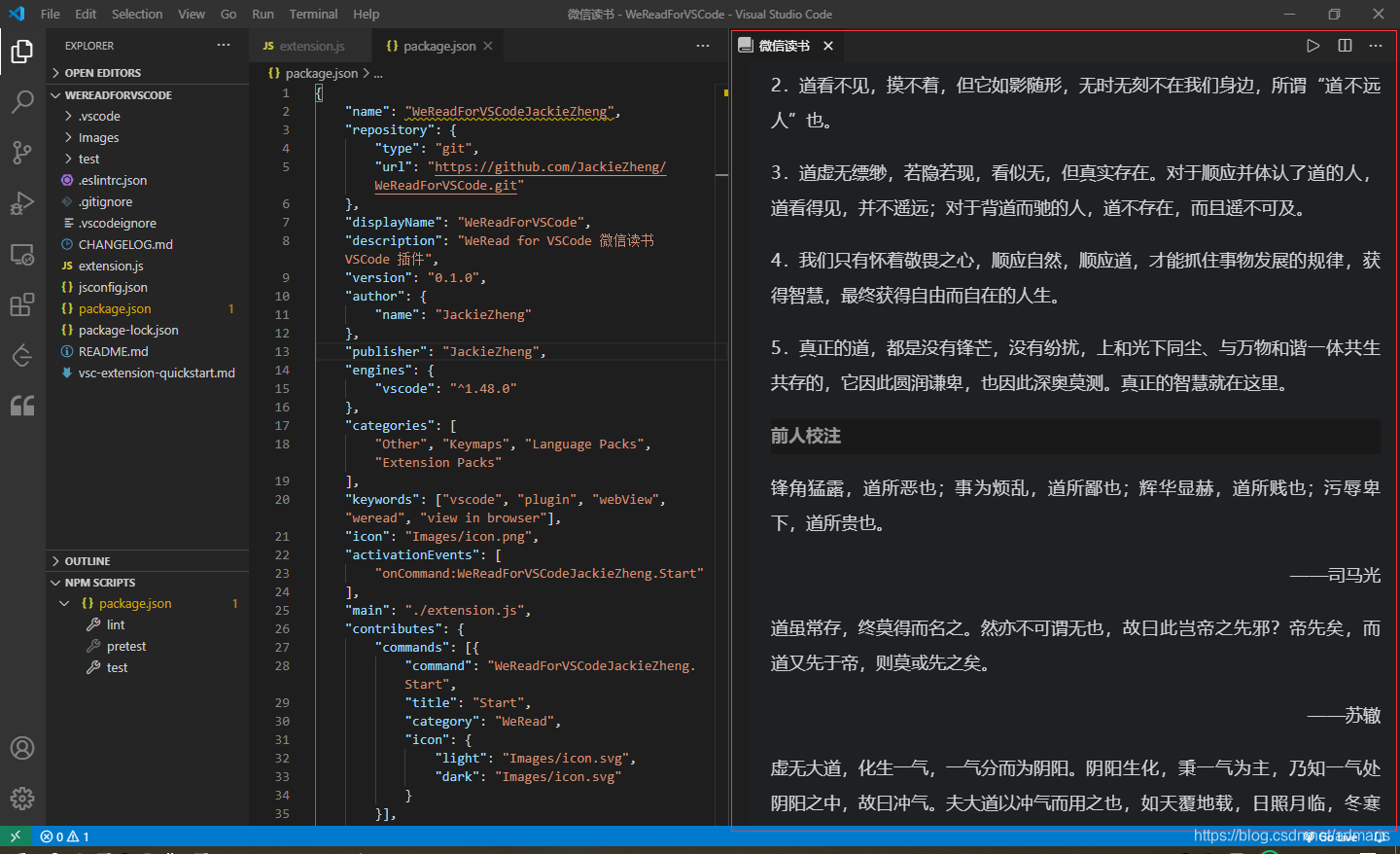 // your extension is activated the very first time the command is executedfunction activate(context) {// The command has been defined in the package.json file// Now provide the implementation of the command with registerCommand// The commandId parameter must match the command field in package.jsonlet disposable = vscode.commands.registerCommand('WeReadForVSCodeJackieZheng.Start', function () {// The code you place here will be executed every time your command is executed// 1.创建并显示Webviewconst panel = vscode.window.createWebviewPanel(// 该webview的标识,任意字符串'WeRead',// webview面板的标题,会展示给用户'微信读书',// webview面板所在的分栏vscode.ViewColumn.One,// 其它webview选项{enableScripts: true, // 启用JS,默认禁用retainContextWhenHidden: true, // webview被隐藏时保持状态,避免被重置});//设置标题前图标panel.iconPath = {dark: vscode.Uri.file(context.extensionPath + '/Images/iconDark.png'),light: vscode.Uri.file(context.extensionPath + '/Images/iconBlack.png')};panel.webview.html = `<!DOCTYPE html><html lang="en"><head><meta charset="UTF-8"><meta content="width=device-width, initial-scale=1.0, maximum-scale=1.0, user-scalable=0" name="viewport"><meta content="portrait" name="x5-orientation"><meta content="true" name="x5-fullscreen"><meta content="portrait" name="screen-orientation"><meta content="yes" name="full-screen"><meta content="webkit" name="renderer"><meta content="IE=Edge" http-equiv="X-UA-Compatible"><title>微信读书</title><style>html,body,iframe{width:100%;height:100%;border:0;overflow: hidden;}</style></head><body><iframe src="https://weread.qq.com/"/></body></html>`;});context.subscriptions.push(disposable);