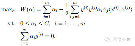 由上面第1式子可以知道,如果我们优化出了α,则直接可以求出w了,即模型的参数搞定。而上面第2个式子可以作为后续优化的一个约束条件。