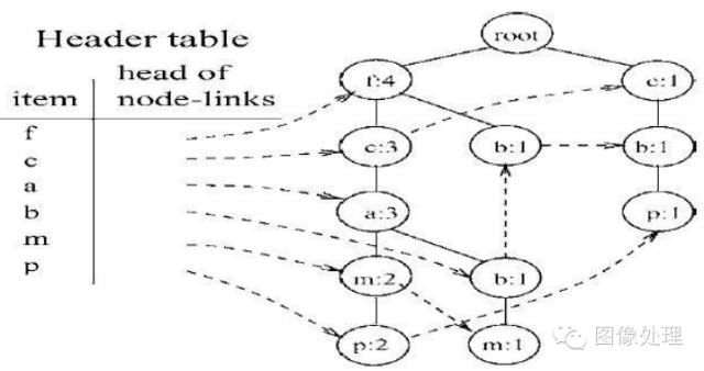 FP Growth是一种比Apriori更高效的频繁项挖掘方法,它只需要扫描项目表2次。其中第1次扫描获得当个项目的频率,去掉不符合支持度要求的项,并对剩下的项排序。第2遍扫描是建立一颗FP-Tree(frequent-patten tree)。