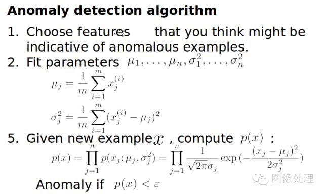 其中的ε也是通过交叉验证得到的,也就是说在进行异常检测时,前面的p(x)的学习是用的无监 督,后面的参数ε学习是用的有监督。那么为什么不全部使用普通有监督的方法来学习呢(即把它看做是一个普通的二分类问题)?主要是因为在异常检测中,异常 的样本数量非常少而正常样本数量非常多,因此不足以学习到好的异常行为模型的参数,因为后面新来的异常样本可能完全是与训练样本中的模式不同。