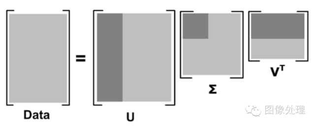 中间的矩阵sigma为对角矩阵,对角元素的值为Data矩阵的奇异值(注意奇异值和特征值是不同的),且已经从大到小排列好了。即使去掉特征值小的那些特征,依然可以很好的重构出原始矩阵。如下图所示: