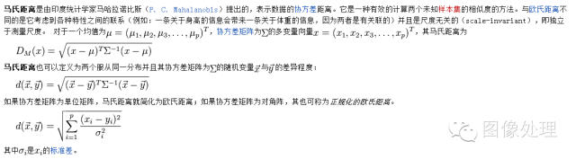 注:马氏距离一定要先给出样本集的统计性质,比如均值向量,协方差矩阵等。关于马氏距离的介绍如下: