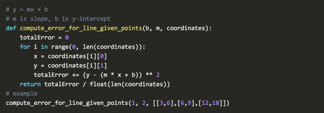 上述代码中,m 是系数,b是预测中的常数,坐标是彗星的位置。我们的目标是找到m和b的组合,使其误差尽可能小。