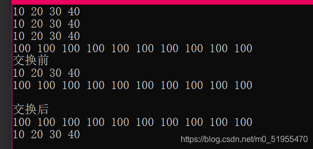 {list<int>L1;L1.push_back(10);L1.push_back(20);L1.push_back(30);L1.push_back(40);list<int>L2;L2.assign(10, 100);cout << "交换前" << endl;printList(L1);printList(L2);cout << endl;L1.swap(L2);cout << "交换后" << endl;printList(L1);printList(L2);