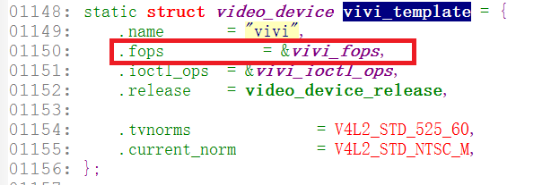 上图是vivi_create_instance函数的一部分,首先分配一个video_device结构体的变量vfd,然后设置*vfd = vivi_template;其中vivi_template是一个video_device的结构体变量,它本身设置好了一些如.fops之类信息(如下图),此操作便相当于设置