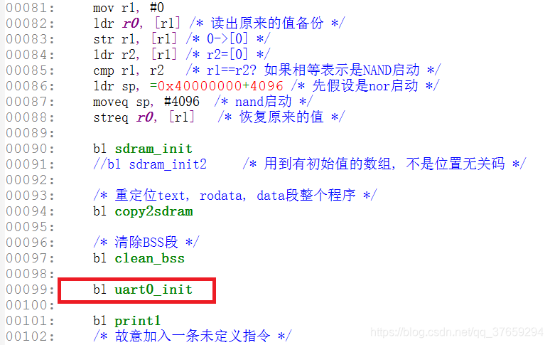 假设我们为NAND启动,在清除了BSS段之后,我们的程序完全拷贝到SDRAM里了,如果我们的程序很大,那么uart0_init就有可能在4K之后,那么采用b1相对跳转必定会出错,所以我们必须使用绝对地址来跳转到SDRAM上,修改代码如下: