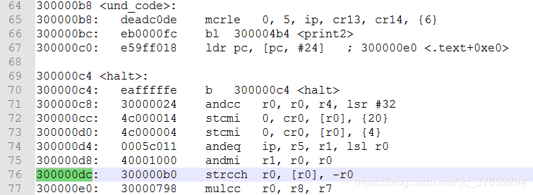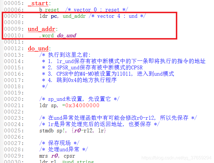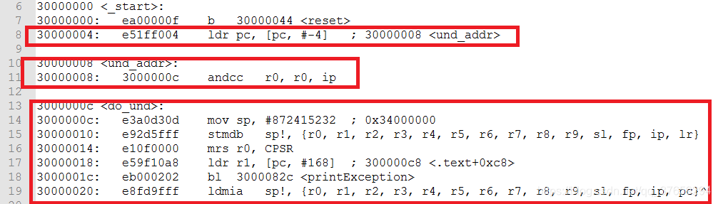 当我们程序出现未定义异常时,会自动跳转到第7行的ldr pc, und_addr,该语句把und_addr(30000008)这个地址里的值(3000000c)赋给了pc,从而实现了绝对跳转,可以看到,我们人为地加入了und_addr:就是把存放要赋给pc的值的内存放到前面来(仅仅在_start:之后,_start:段存放的信息很少,所以不会出现上面用ldr伪指令存在的问题)