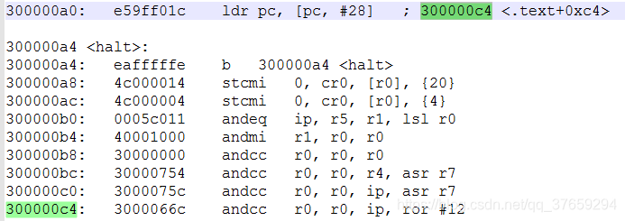 下面我们再来看ldr pc, =main,该指令为绝对跳转指令,我们可以通过反汇编来查看:下图的第一行ldr pc, [pc, #28],把pc的值赋为pc当前值+28的地址里的内容,也就是300000c4地址里的内容3000066c,也就是把pc指向main函数的地址,为绝对跳转。