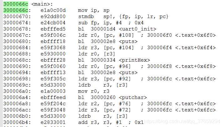 上图清除完bss区后使用b1指令跳转到30000668,要注意b1是相对跳转指令,后面写着30000668并不是说一定跳转到这个地址,这里之所以写出这个地址是方便我们看而已,如果在程序运行时我们当前的pc值为000000a0,那么则是跳转到00000668。
