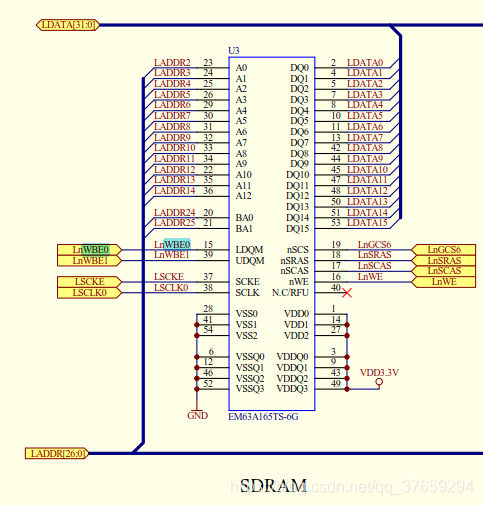 注:(这个电路图本来在右边还有一块SDRAM的,也就是扩展成32个数据线的扩展内存,所以CPU的LADDR2连内存芯片的A0,后面以此类推,我这里讲的是16位的情况,那么应该是LADDR1连扩展内存的A0)