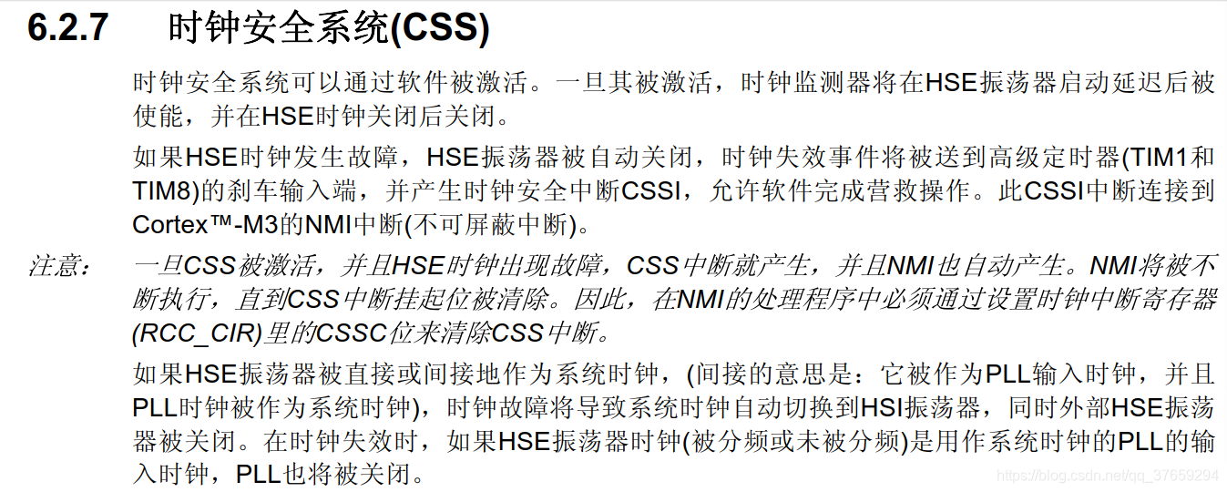 上面还漏了一点,关于CSS,CSS为时钟安全系统,在STM32参考手册6.2.7小节有提到,开发者可以通过CSS中断设置HSE故障后的系统时钟,比如HSI/2(4MHz)的16倍频,如果开发者未开启CSS中断或者在中断中没有进行相应