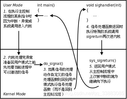 如果该信号的处理方式为捕捉,则内核对该信号进行捕捉,同时调用相应的用户处理函数,回到用户态执行相应的用户处理函数(注意不是回到主控制流程)。