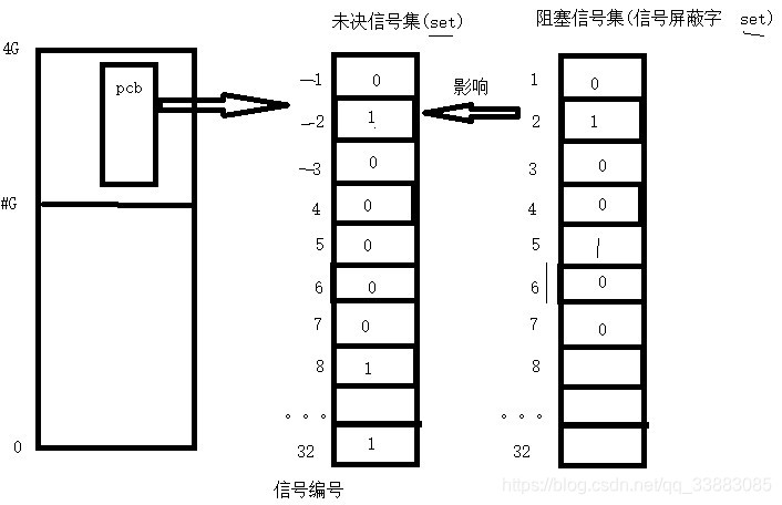 Linux内核的进程控制块PCB是一个结构体,task_struct, 除了包含进程id,状态,工作目录,用户id,组id,文件描述符表,还包含了信号相关的信息,主要指阻塞信号集和未决信号集。未决信号集和阻塞信号集(信号屏蔽字),它们都是一个集合(set,即不重复但是无序)。集合(set)里存储的是数字(信号编号,从1开始),对应的0表示假,1表示真。即在阻塞信号集中,0表示未阻塞,1表示阻塞。