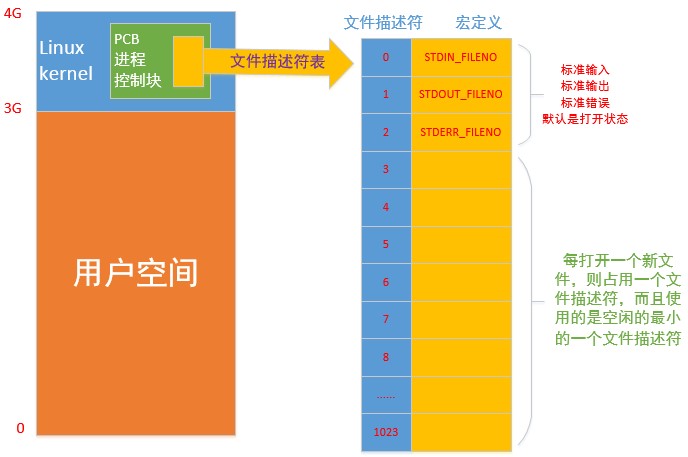 每一个进程的进程控制块PCB都位于内核区,在每一个进程的PCB中有一个文件描述符表(是一个数组),用于标记该进程所打开的所有文件。从文件描述符表可以看出每一个进程最多能打开1024个文件,其中有三个文件默认是一直处于打开状态的(即进程创建完成时就处于打开状态),分别是:标准输入 STDIN_FILENO,其文件描述符为0;标准输出 STDOUT_FILENO,其文件描述符为1;错误输出 STDERR_FILENO,其文件描述符为2,其中文件描述符0和1可以省略不写。供我们用户打开的文件,只能够占据从3开始的位置(即其文件描述符为3以后的数字,3~1023)。每打开一个文件就会占用一个文件描述符,且使用的是空闲的最小的一个文件描述符。