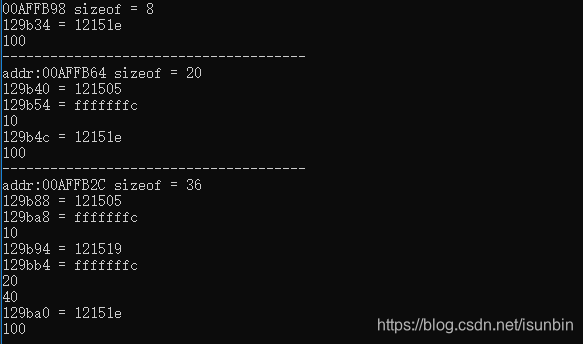 {A a;int* ptr;ptr = (int*)&a;cout << ptr << " sizeof = " << sizeof(a) << endl;for (int i = 0; i < sizeof(A) / sizeof(int); i++){if (ptr[i] < 10000){cout << dec << ptr[i] << endl;}elsecout << hex << ptr[i] << " = " << hex << *((int*)(ptr[i])) << endl;}cout << "--------------------------------------" << endl;B b;ptr = (int*)& b;cout << "addr:" << ptr << " sizeof = " << sizeof(b) << endl;for (int i = 0; i < sizeof(B) / sizeof(int); i++){if (ptr[i] < 10000){cout << dec << ptr[i] << endl;}elsecout << hex << ptr[i] << " = " << hex << *((int*)(ptr[i])) << endl;}cout << "--------------------------------------" << endl;D d;ptr = (int*)& d;cout << "addr:" << ptr << " sizeof = " << sizeof(d) << endl;for (int i = 0; i < sizeof(D) / sizeof(int); i++){if (ptr[i] < 10000){cout << dec << ptr[i] << endl;}elsecout << hex << ptr[i] << " = " << hex << *((int*)(ptr[i])) << endl;}return 0;
