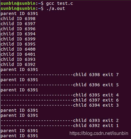 {pid_t pid;int i;for (i = 0; i < 10; i++){if ((pid = fork()) == 0)break;else if (pid < 0)sys_err("fork");}if (pid == 0) //子进程{int n = 1;while (n--){printf("child ID %d\n", getpid());sleep(1);}return i + 1;}else if (pid > 0) //父进程{struct sigaction act; act.sa_handler = do_sig_child;sigemptyset(&act.sa_mask);act.sa_flags = 0;sigaction(SIGCHLD, &act, NULL); while (1){printf("parent ID %d\n", getpid());sleep(1);}}return 0;