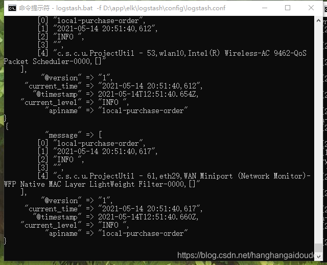 输入命令:logstash -f D:\app\elk\logstash\config\logstash.conf