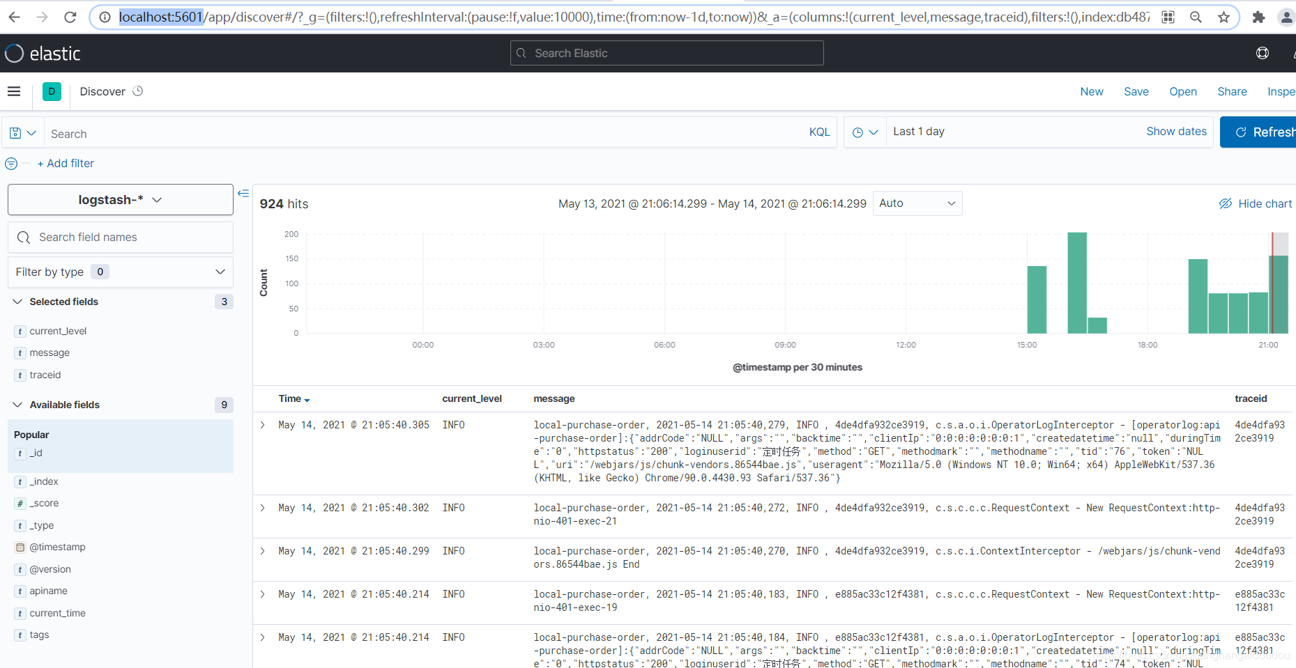 }filter { mutate {split => { "message" => "|" }}if [message][0] {mutate { add_field => {"apiname" => "%{[message][0]}"}}}if [message][1] {mutate { add_field => {"current_time" => "%{[message][1]}"}}} if [message][2] {mutate { add_field => {"current_level" => "%{[message][2]}"}}} if [message][3] {mutate { add_field => {"traceid" => "%{[message][3]}"}}}}output {elasticsearch {hosts => ["http://localhost:9200"]#index => "local-purchase-order | %{+YYYY-MM-dd}"index => "logstash-%{+YYYY-MM-dd}"#template_name => "logstash"#template_overwrite => true#index => "%{[@metadata][beat]}-%{[@metadata][version]}-%{+YYYY.MM.dd}"#user => "elastic"#password => "changeme"}stdout{codec => rubydebug}