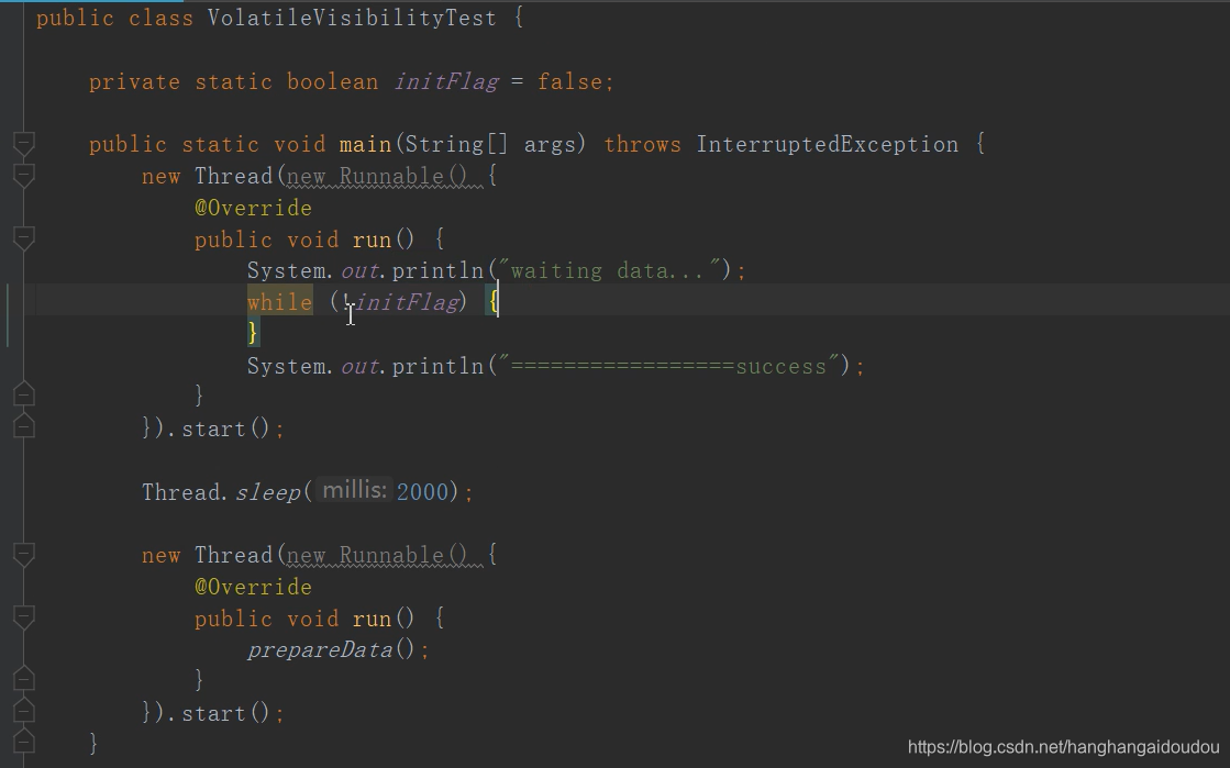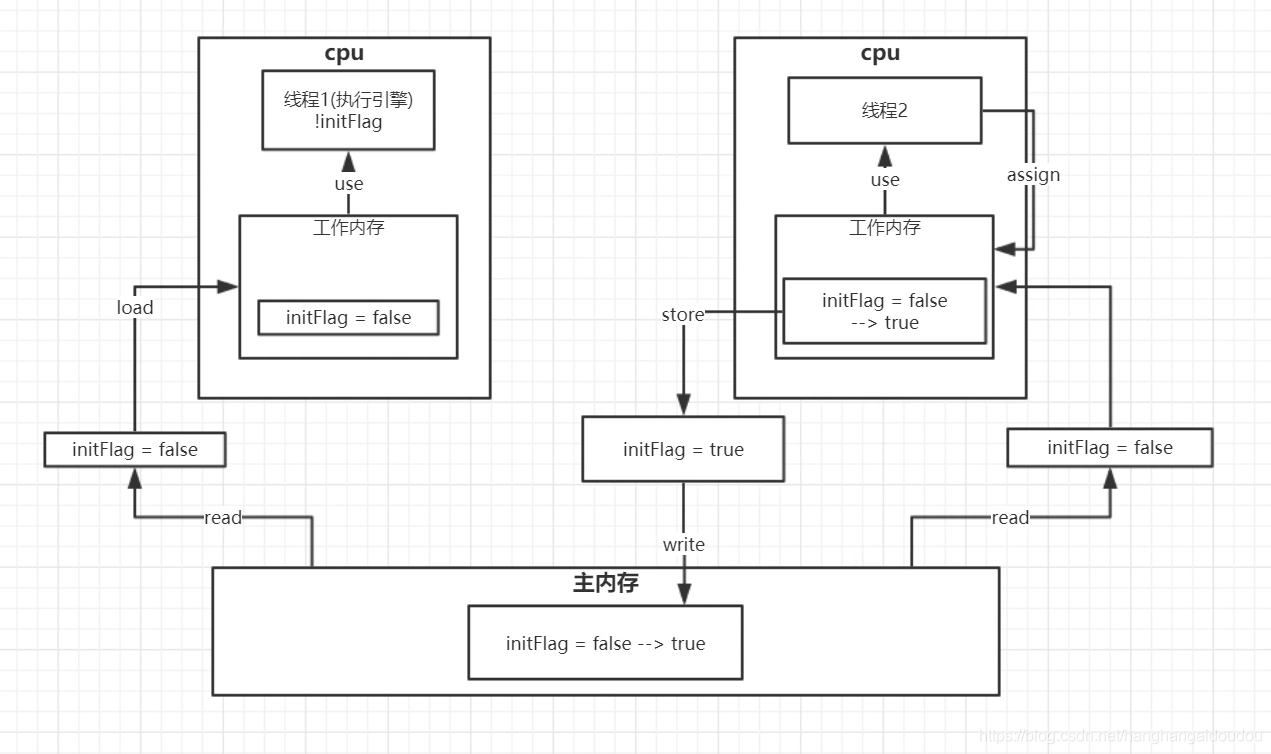 从此可以看出,第一个线程并没有退出,initFlag因为在第一个线程没有变成false,因为是工作内存