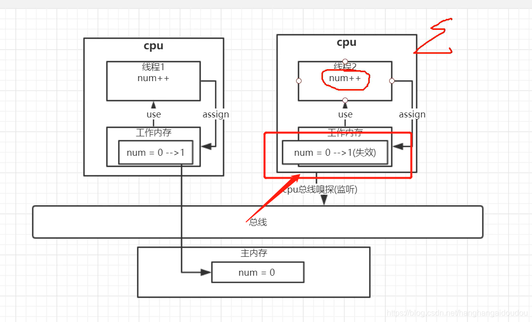 线程1回写主内存后,线程2失效了,又重新读主内存到工作内存,值和线程1的一样,然后把工作内存写回主内存,就原来正常先后顺序是12,结果同时情况下就变成11