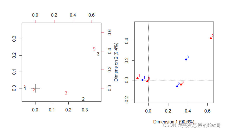进行简单相应分析可以使用MASS包内的corresp()函数,也可以使用ca包中的ca()函数,个人比较推荐使用ca()函数