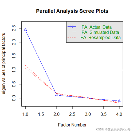- fa.parallel()用:fa.parallel(x,n.obs=NULL,fm=”minres”,fa=”both”,…)