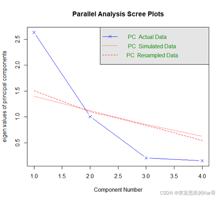 碎石图评估主成分个数的具体方法时查看高度为1的横线或两条红色虚线上方的散点个数。横线是特征值为1的高度,红色虚线是随机数据矩阵的平均特征值。在主成分或因子个数增加的时候,如果真实数据特征值低于随机数据的平均特征值,这时候说明之后的因子或主成分没有保留的价值。