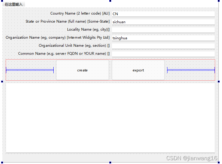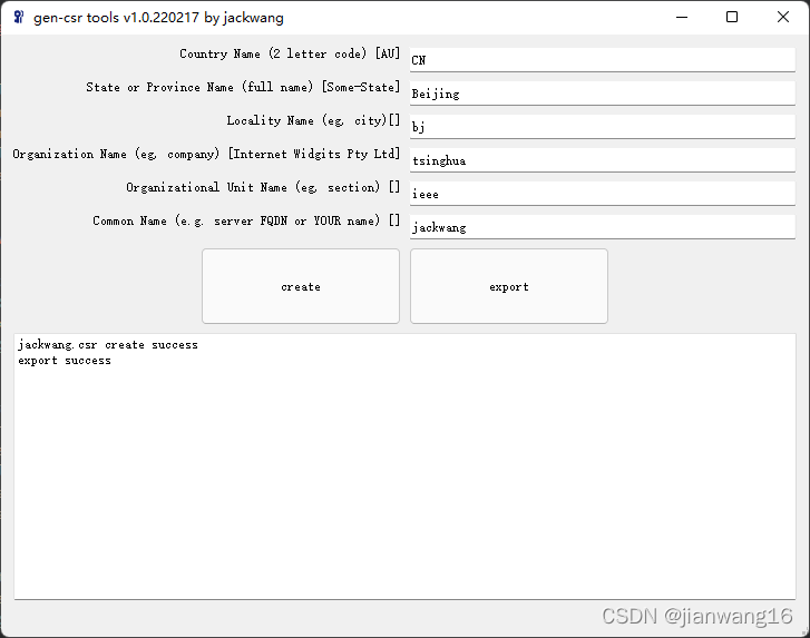 {/*! check valid */if (ui->lineEdit_country->text().isEmpty()) {QMessageBox::about(NULL, "notice", "country is empty, error!");return;}if (ui->lineEdit_city->text().isEmpty()) {QMessageBox::about(NULL, "notice", "city is empty, error!");return;}if (ui->lineEdit_province->text().isEmpty()) {QMessageBox::about(NULL, "notice", "province is empty, error!");return;}if (ui->lineEdit_organization->text().isEmpty()) {QMessageBox::about(NULL, "notice", "organization is empty, error!");return;}if (ui->lineEdit_unit->text().isEmpty()) {QMessageBox::about(NULL, "notice", "unit is empty, error!");return;}if (ui->lineEdit_name->text().isEmpty()) {QMessageBox::about(NULL, "notice", "name is empty, error!");return;}/*! create pri and pub key */FILE* private_key_file;FILE* public_key_file;private_key_file = fopen("./prikey.pem", "w+");public_key_file = fopen("./pubkey.pem", "w+");int bits = 1024;unsigned long e_value = RSA_3;BIGNUM* bne = BN_new();if (1 != BN_set_word(bne, e_value)) {QMessageBox::about(NULL, "notice", "openssl set bne word error!");BN_free(bne);return;}RSA* rsa = RSA_new();if (1 != RSA_generate_key_ex(rsa, bits, bne, NULL)) {QMessageBox::about(NULL, "notice", "openssl rsa gen error!");RSA_free(rsa);rsa = NULL;return;}PEM_write_RSAPrivateKey(private_key_file, rsa, NULL, NULL, 0, NULL, NULL);PEM_write_RSA_PUBKEY(public_key_file, rsa);RSA_free(rsa);rsa = NULL;BN_free(bne);bne = NULL;fclose(private_key_file);fclose(public_key_file);/*! create csr */// 1. set version of x509 reqX509_REQ* x509_req = X509_REQ_new();int nVersion = 1;if (1 != X509_REQ_set_version(x509_req, nVersion)) {QMessageBox::about(NULL, "notice", "X509 req set version error!");X509_REQ_free(x509_req);return;}// 2. set subject of x509 reqX509_NAME* x509_name = X509_REQ_get_subject_name(x509_req);const char* pbCN = NULL; const char* pbOU = NULL; const char* pbO = NULL; const char* pbL = NULL; const char* pbST = NULL;const char* pbC = NULL; QByteArray ba;ba.clear();ba.append(ui->lineEdit_name->text().toUtf8());pbCN = ba.data();ba.clear();ba.append(ui->lineEdit_unit->text().toUtf8());pbOU = ba.data();ba.clear();ba.append(ui->lineEdit_organization->text().toUtf8());pbO = ba.data();ba.clear();ba.append(ui->lineEdit_city->text().toUtf8());pbL = ba.data();ba.clear();ba.append(ui->lineEdit_province->text().toUtf8());pbST = ba.data();ba.clear();ba.append(ui->lineEdit_country->text().toUtf8());pbC = ba.data();X509_NAME_add_entry_by_txt(x509_name, "CN", V_ASN1_UTF8STRING, (const unsigned char*)pbCN, -1, -1, 0);X509_NAME_add_entry_by_txt(x509_name, "OU", V_ASN1_UTF8STRING, (const unsigned char*)pbOU, -1, -1, 0);X509_NAME_add_entry_by_txt(x509_name, "O", V_ASN1_UTF8STRING, (const unsigned char*)pbO, -1, -1, 0);X509_NAME_add_entry_by_txt(x509_name, "L", V_ASN1_UTF8STRING, (const unsigned char*)pbL, -1, -1, 0);X509_NAME_add_entry_by_txt(x509_name, "ST", V_ASN1_UTF8STRING, (const unsigned char*)pbST, -1, -1, 0);X509_NAME_add_entry_by_txt(x509_name, "C", V_ASN1_UTF8STRING, (const unsigned char*)pbC, -1, -1, 0);// 3. set public key of x509 reqconst char* key_file_path = "./prikey.pem";BIO* key_file_BIO = BIO_new_file(key_file_path, "r");if (key_file_BIO == NULL) {QMessageBox::about(NULL, "notice", "BIO new file error!");BIO_free_all(key_file_BIO);X509_REQ_free(x509_req);return;}rsa = PEM_read_bio_RSAPrivateKey(key_file_BIO, NULL, NULL, NULL);if (rsa == NULL) {QMessageBox::about(NULL, "notice", "PEM read bio RSAPrivateKey error!");BIO_free_all(key_file_BIO);X509_REQ_free(x509_req);RSA_free(rsa);return;}EVP_PKEY* pKey = EVP_PKEY_new();EVP_PKEY_assign_RSA(pKey, rsa);rsa = NULL; // will be free rsa when EVP_PKEY_free(pKey)if (1 != X509_REQ_set_pubkey(x509_req, pKey)) {QMessageBox::about(NULL, "notice", "X509 REQ set pubkey error!");BIO_free_all(key_file_BIO);X509_REQ_free(x509_req);EVP_PKEY_free(pKey);RSA_free(rsa);return;}// 4. set sign key of x509 reqint ret = X509_REQ_sign(x509_req, pKey, EVP_sha1()); // return x509_req->signature->lengthif (ret <= 0) {QMessageBox::about(NULL, "notice", "X509 REQ sign error!");BIO_free_all(key_file_BIO);X509_REQ_free(x509_req);EVP_PKEY_free(pKey);RSA_free(rsa);return;}m_file_name = ui->lineEdit_name->text();ba.clear();QString csr_file = m_file_name + ".csr";ba.append(csr_file.toLatin1());BIO* out = BIO_new_file(ba.data(), "w");if (1 == PEM_write_bio_X509_REQ(out, x509_req)) {QMessageBox::about(NULL, "notice", QString("create %1 success!").arg(ui->lineEdit_name->text() + ".csr"));ui->textEdit_csr_msg->append(ui->lineEdit_name->text() + ".csr create success");} else {QMessageBox::about(NULL, "notice", "creat csr error!");}BIO_free_all(key_file_BIO);X509_REQ_free(x509_req);EVP_PKEY_free(pKey);BIO_free_all(out);RSA_free(rsa);