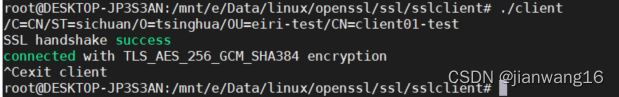 {SSL_CTX* ctx;int server;SSL* ssl;char buf[1024];pthread_t pid;int retryTimeSec;struct sigaction sigact;sigemptyset(&sigact.sa_mask);sigact.sa_flags = 0;sigact.sa_handler = sig_handler;sigaction(SIGQUIT, &sigact, NULL); /* Ctrl-\ */sigaction(SIGINT, &sigact, NULL); /* Ctrl-C 8*/sigaction(SIGTERM, &sigact, NULL); /* default "kill" command */sigaction(SIGPIPE, &sigact, NULL); /* ignore SIGPIPE */SSL_library_init();ctx = init_ctx();//SSL_CTX_set_verify(ctx, SSL_VERIFY_PEER, NULL); /* if need verify server cert */load_cert_key_ca_file(ctx, CLIENT_CA, CLIENT_KEY, CA_CERT);show_cert_file(CLIENT_CA);RETRY:server = connect_server(ADDR, PORT);ssl = SSL_new(ctx); /* create new SSL connection state */SSL_set_fd(ssl, server); /* attach the socket descriptor */if (SSL_connect(ssl) == FAIL) { /* perform the connection */printf("SSL handshake error, rerey timeout %ds\r\n", SSL_RETRY_DELAY_SEC);close(server); /* close socket */retryTimeSec = SSL_RETRY_DELAY_SEC;while (retryTimeSec--) {if (!quit_sig && !exit_sig) {SSL_CTX_free(ctx); /* release context */printf("exit client\r\n");}sleep(1);}goto RETRY;} else {printf("SSL handshake success\r\n");const char* req = "jackwang client request";printf("connected with %s encryption\n", SSL_get_cipher(ssl));isServerDisconnect = false;pthread_create(&pid, NULL, (void* (*)(void*))thread_recv, (void*)ssl);while (!quit_sig && !exit_sig && !isServerDisconnect) {/* get any certs */memset(buf, 0, 1024);SSL_write(ssl, req, strlen(req)); /* encrypt & send message */sleep(1);}SSL_free(ssl); /* release connection state */}pthread_cancel(pid);pthread_join(pid, NULL);close(server); /* close socket */SSL_CTX_free(ctx); /* release context */printf("exit client\r\n");return 0;