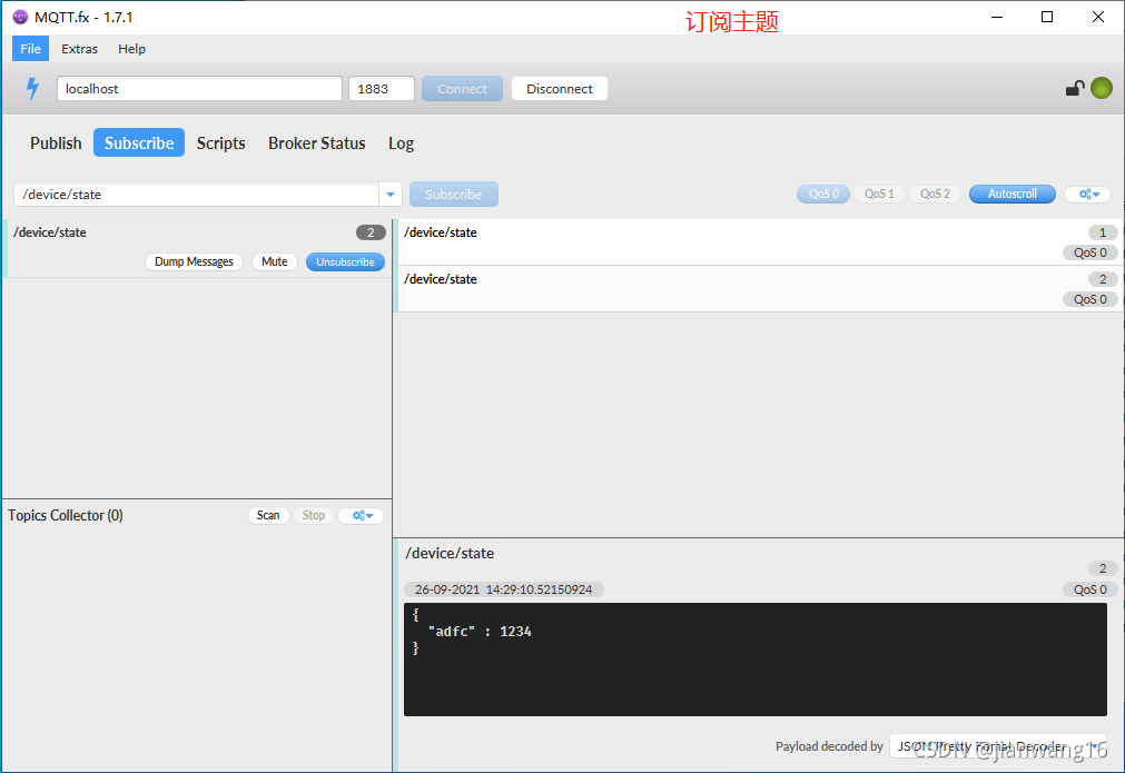 打开l两个客户端,一个订阅“/device/state”,一个往该主题上发布内容