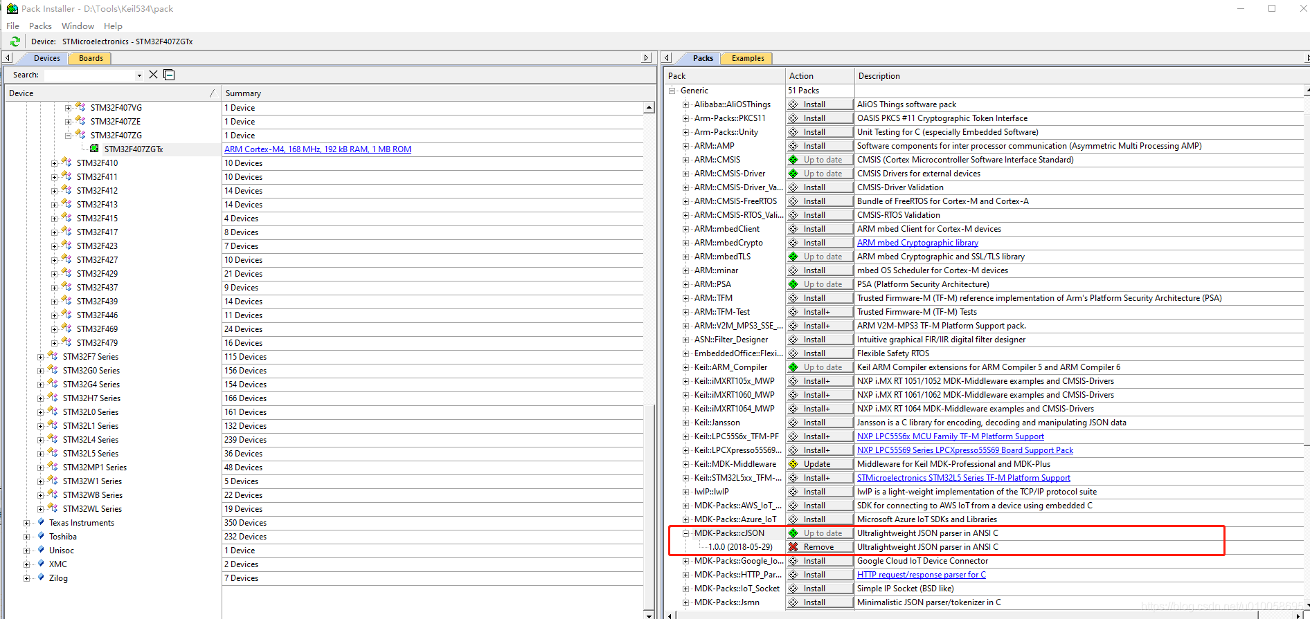 MDK中打开Pack Install,选择Generic下边MDK-Pack::cJSON,点击安装Install