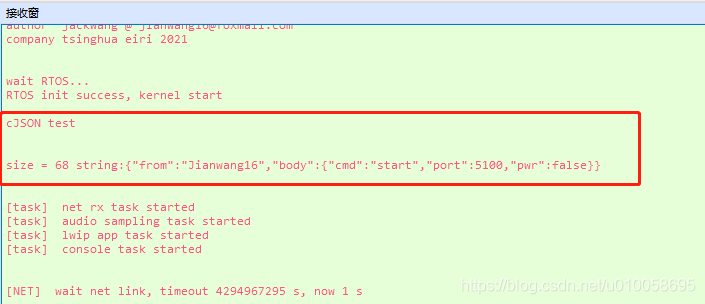(4)cJSON几乎都是动态内存分配,所以使用json对象结束后需要清理内存,清理root对象即可,如果调用了cJSON打印,则需要清理打印输出的char 指针,例如: