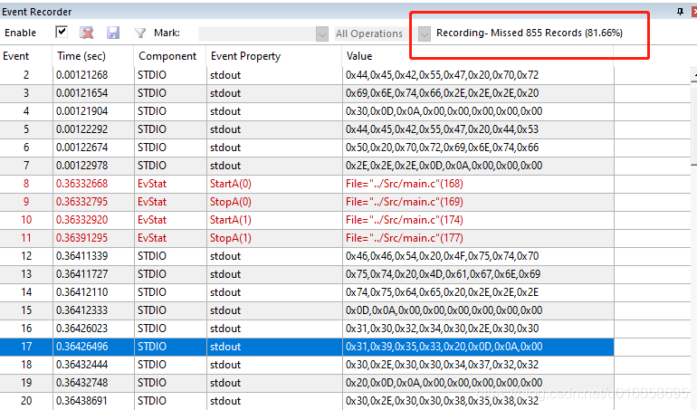 采用STLINK EventRecorder 对printf进行重定义,在连续发送数据时,存在较大的丢包情况。因此,调试小数据量时可以采用这种方法,大数据量的时候还是直接用UART 进行输出。