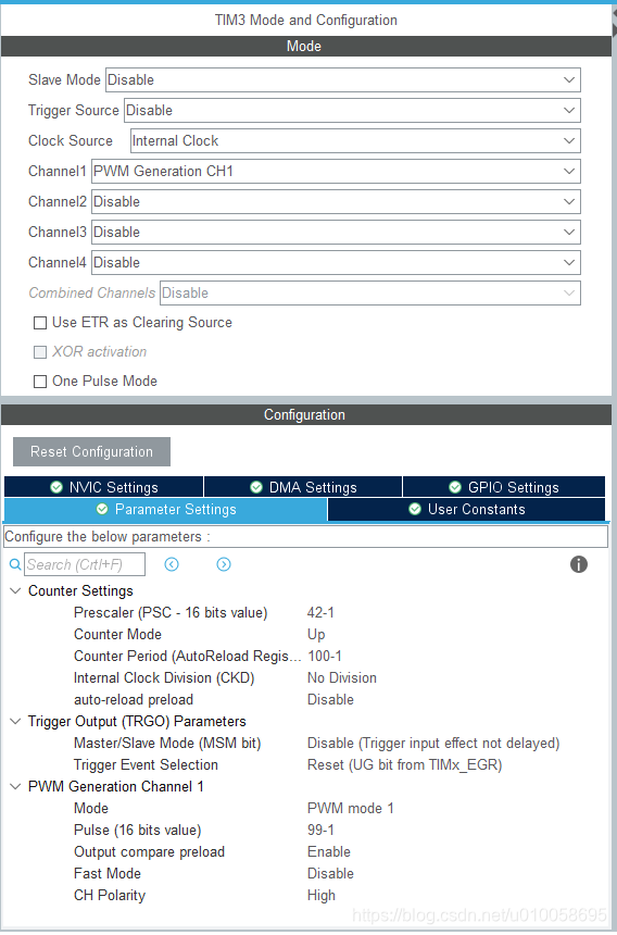 配置TIM3为PWM 输出通道1,输出98%占空比的脉冲去驱动AD7606,频率配置为10kHz,(42MHz/42/100 = 10kHz = 100us),占空比配置设置Pulse为98 (98/100 = 98%, 低电平持续时间2us, 需要大于25ns)和CH Polarity为高电平。根据AD7606的时序要求,配置占空比即可。