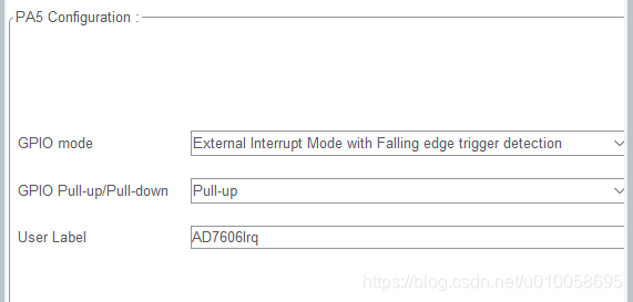 AD7606Rst(PA1)、AD7606Cs(PA2)配置成输出模式,AD7606Irq(PA5)配置成外部中断模式,下降沿触发,并开启全局中断。